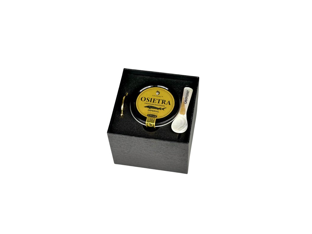 Ikona mezi kaviáry. Osietra je ceněná pro svou komplexní, oříškově vznešenou chuť. Luxusní set obsahuje kaviár, perleťovou lžičku a otvírák — ideální dárek pro skutečné gurmány.